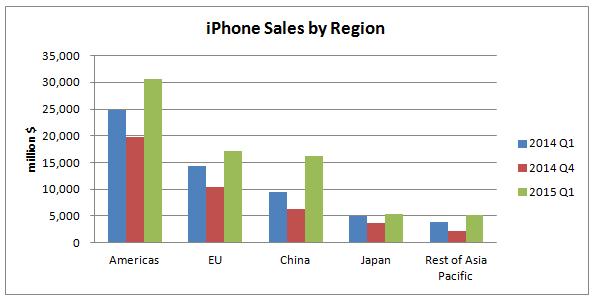 上のグラフをご覧頂きます様に、2015 Q1においては日本の伸びはそれほどでもないのに対して、中国での伸びが突出しているのが分かります。