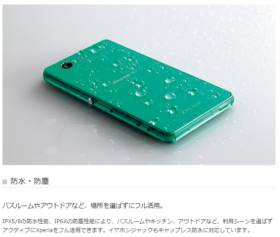 Xperia Z3 Compactには、防水性能としてIPX5/8と書かれていますが、これがどの程度のレベルか下の表で確認しておきましょう。