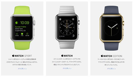 1つ目がスポーツタイプで廉価版のApple Watch Sport、2二つ目がスタンダードとなるApple Watch、3つ目がラグジュアリーなゴールドケースのApple