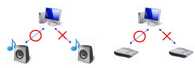 例えば、左下の図の様に1つのPCで2つのBluetooth対応スピーカーを、同時に鳴らす事はできないという事です。