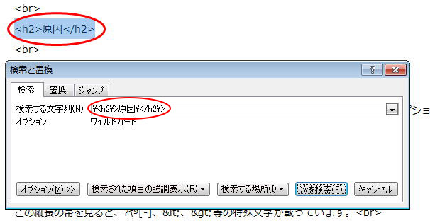 ですので、これらの文字の前に¥を付けて、”¥<h2¥>原因¥</h2¥>”と入力すればワイルドカードを有効にしていても検索してくれます。