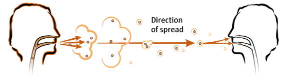 マスクを推奨しない国において、人と人とは2m以上離れ(social distancing )るのを推奨するのはこのためです。
