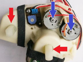 ここで重要なのは、フタと便座の軸の向き(青丸部)と、二つの軸の向きを検知するポテンションメーター(ボリューム)(赤丸部)の位置です。