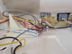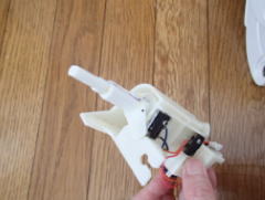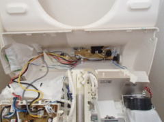 ![]() 2) 水道の元栓を閉める 今回の修理では水回りは触れないのですが、念のために元栓は閉めておきましょう。 ![]() 5) フィルターを外す。 上カバーを外すとき、内部の部品と干渉するのが心配なので、念のためフィルターを外しておきます。 ![]() 3) 右側面の四角ボタンを押し、便座本体を持ち上げて土台から外す。 パナソニックの温水便座の場合、便器下のネジを緩めないでも、簡単に便座が取り外せる様になっています。 ![]() このため、四角ボタンを押しながら、便座の奥側を持ち上げると、簡単に便器から分離する事ができます。 4) 便座を手前にずらし、便座奥のビス2本を外す。 便座が外れたら、便座を手前にずらして、奥にあるビス2本を外します。 ![]() 6) フタを外す。 フタは回転部を両側に引っ張れば、簡単に外せます。 ![]() 7) 上カバーを外す。 上カバーは後ろを少し持ち上げて、手前に引きながら持ち上げれば、簡単に外れるかと思いきや、そんなに上手くはいきません。 このため、力ずくで手前のパッチン爪を外すしかありません。 そこで活躍するのが、前述のカバー開け工具(写真のオレンジ色の工具)です。 ![]() これを上カバーの隙間に差し込んで、テコの原理で上外します。 7) コネクターを外す。 ![]() 上カバーを持ち上げて、内側のコネクターを外します。 8) 上ユニットを取り外す ![]() コネクターを全て外したら、上カバーを取り外します。 9) ヒンジユニットを外す。 ビス3本を外して、ヒンジユニットを外します。 ![]() 10) ヒンジユニットを観察する。 下がヒンジユニットです。 ![]() ![]() ![]() ![]() これからこれを分解します、と言いたい所ですが、ご覧の通り片側にCリングが付いていたりと、分解した後の組立が大変そうです。 また分解しても直せる目途もありません。 しょうがないので諦めようかと思ったのですが、一つ良い手を思いつきました。 分解せずに、このヒンジユニットを少し傾けて取り付けてやろうというのが今回のミソになります。 11) ヒンジユニットを傾ける。 さてその方法ですが、ヒンジユニットをビス止めする箇所にスペーサーを追加すれば何とかなりそうです。 ![]() 左のネジ3本が元々のねじ、4本目のネジが今回使用したネジ そのスペーサーですが、固定ネジの呼び径が3mmですので上手い具合にM5のナットが使える事が分かりました。 ただしナットの厚みが4mmほどありますので、固定ビスを少し長くしてやる必要があります。 オリジナルのネジの首下が10mmに対して、上手い具合に12mmのネジがあったので、それを使う事にします。 12) スペーサーを入れてヒンジユニットをビス止めする。 下の写真の様にネジにスペーサー(ナット)をセットして、ナットを落とさない様にヒンジユニットを組み付けます。 ![]() ![]() 赤丸のネジの下にスペーサーを入れる ヒンジユニットを傾けるために、もう1箇所にもスペーサーを追加したかったのですが、2か所に入れるとうまく組み込めないので諦めました。 13) 傾きチェック ヒンジユニットを固定したら、上ユニットにカバーを取り付けて、傾き具合をチェックします。 ![]() 対策前(左)と対策後(右) 生憎同じ角度の写真がないのですが、左上の写真の様に前傾だったのが、右上の写真の様に何とか後ろに傾く様になりました。 14) 組み立て 分解と逆の順で全てを組み上げ、動作確認をして終了です。 まとめ