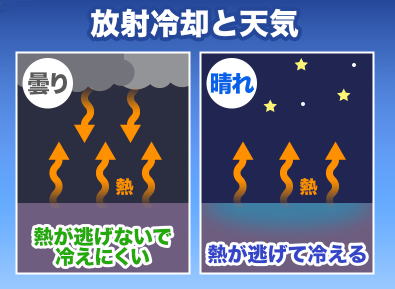 夜曇っていると翌朝寒くて、夜晴れていると翌朝寒いというあれです。