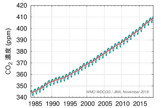上は気象庁のHPにある二酸化炭素濃度の推移を示すチャートですが、このチャートによれば1985年に二酸化炭素が0.0345%だったのに対して、2019年は0.041%ですので、たった34年の間に19%も増えているのです。