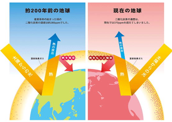①数十年前、大気中に占める二酸化炭素の割合は0.03%程であった。