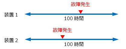 ですが、上の図の様にどちらの装置も100時間に1回は必ず故障するとしたら、故障の間隔が200時間に1回になるとも思えません。