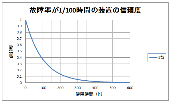 すなわち、故障率が1/100時間の装置を1時間使うだけなら、この間99.0%の確率で問題なく(故障する事なく)使えるという事です。