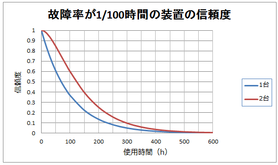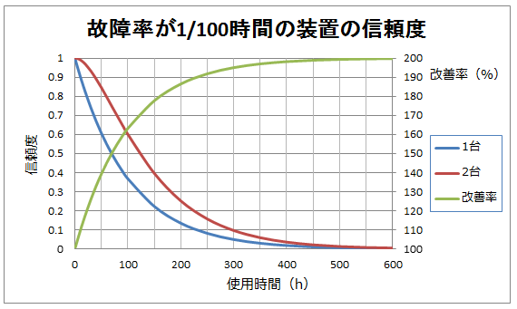 例えば、100時間使った場合の信頼度は、1台の場合で0.37、2台の場合で0.60ですので、信頼度は163%にアップした事になります。