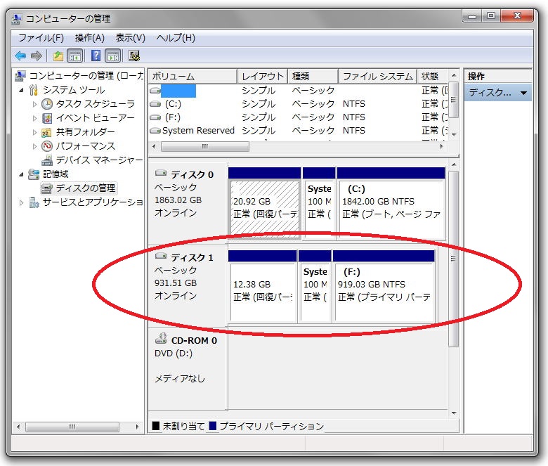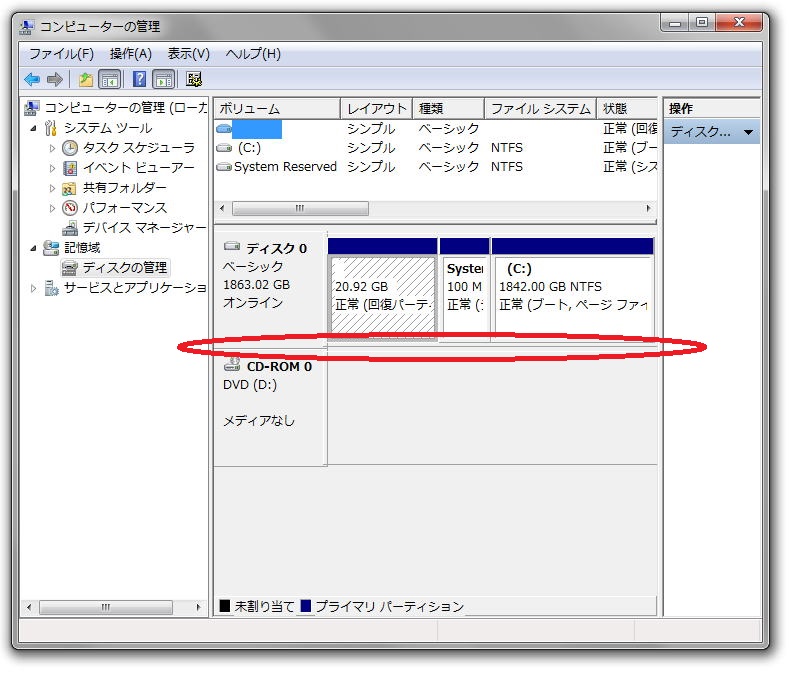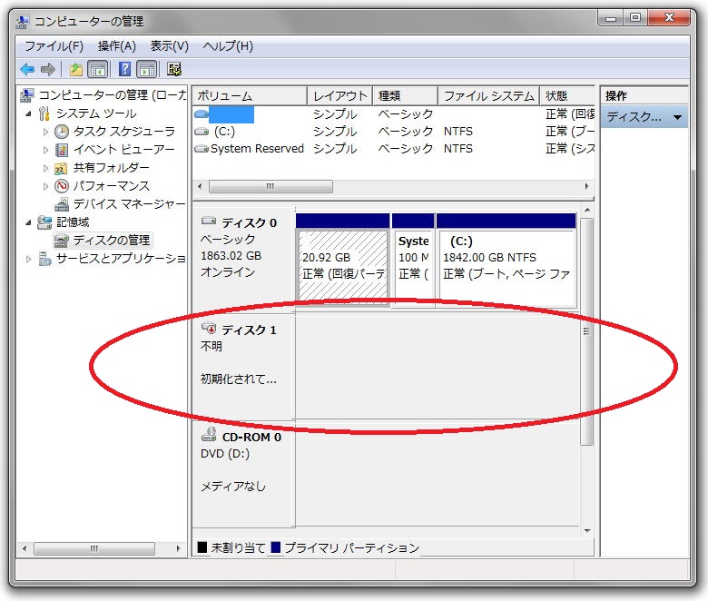一番悪い状態が、以下の様に”ディスクの管理画面”に単体HDDが全く表示されない場合です。