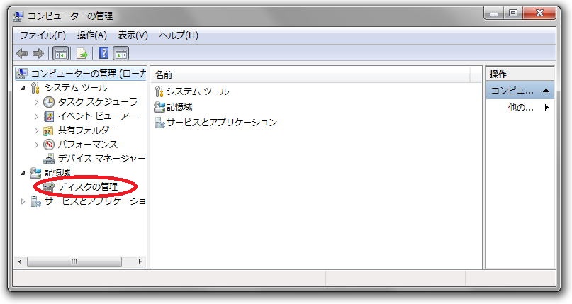 表示された”コンピューターの管理画面”のサイドメニューから、さらに”ディスクの管理”を選択します。
