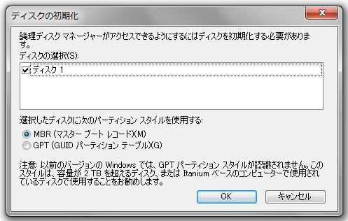 なお上記画面が表示される前に、下の”ディスクの初期化画面”が表示される事がありますが、当然ながらキャンセルを選択しておきましょう。