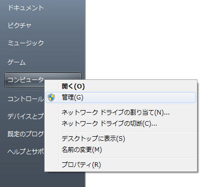 具体的には、”スタート”→”コンピュータ”を右クリック→”管理”を選択します。