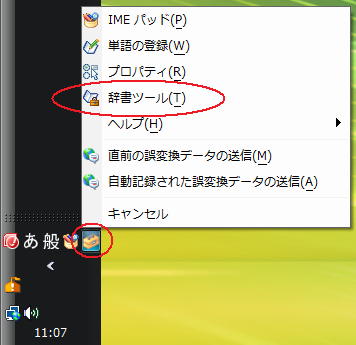 1)PCのツールバーの中にある工具箱(ツール)を左クリックし、表示されたメニューから”辞書ツール”を選択します。