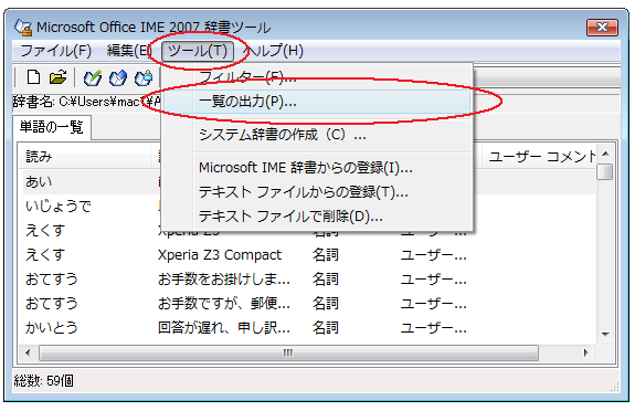 2)Microsoft Office IME 2007辞書ツール画面から、ツールを選択し、さらに”一覧の出力”を選択します。