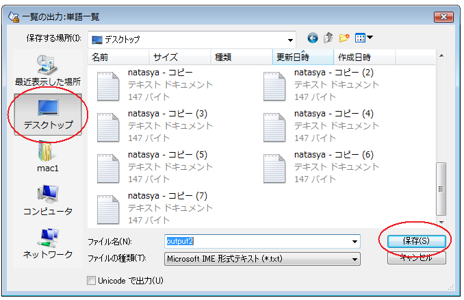 4)一覧出力:単語一覧画面において”デスクトップ”を選択して、保存をクリックします。