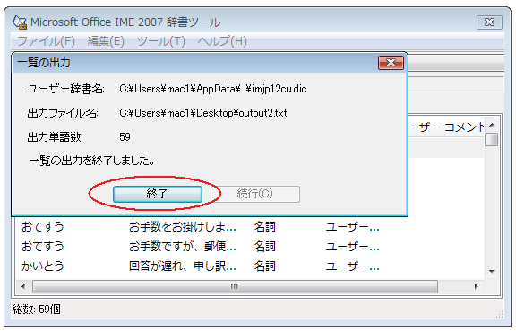 5)テキスト形式のユーザー辞書がoutput2という名称でデスクトップ上に保存されたので、出力単語数を確認して終了をクリックします。