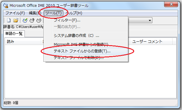 3)Microsoft Office IME 2010辞書ツール画面から、ツールを選択し、さらに”テキストファイルからの登録”を選択します。