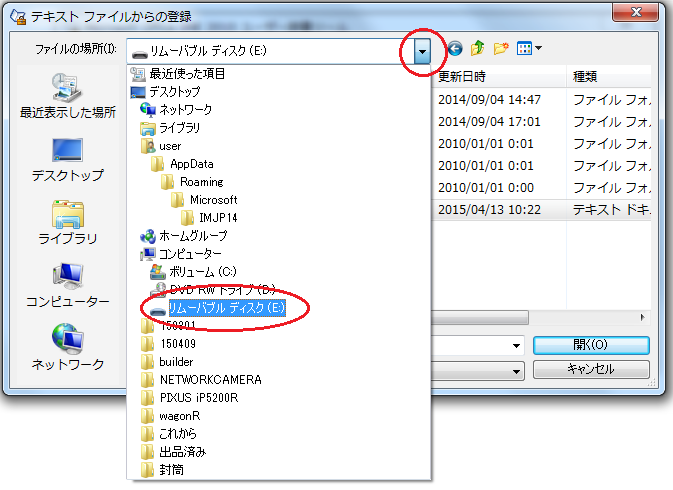 5)▼マークをクリックし、1)で挿入したリムーバルディスクを選択します。