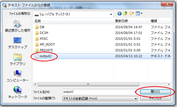 6)表示されたリムーバルディスクの中身からoutput2を選択し、開くをクリックします。