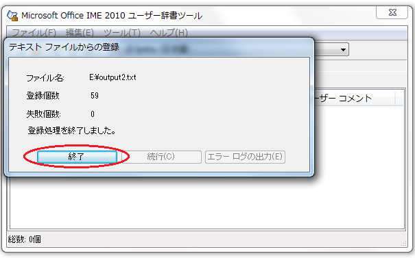 7)テキストファイルからの登録画面が開くので、登録個数を確認して終了をクリックします。