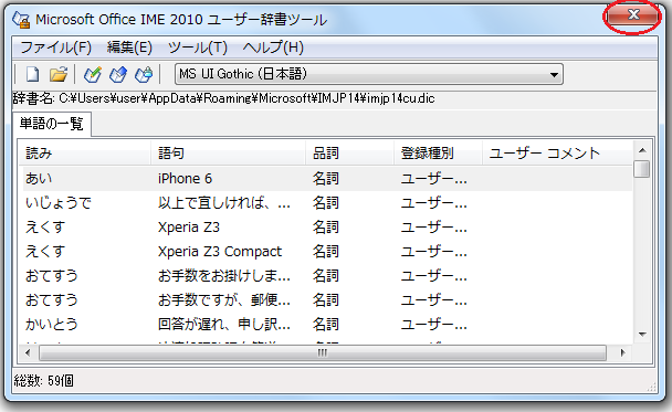 8)Microsoft Office IME 2010辞書ツール画面に、辞書が追加されたことを確認したのち、×マークをクリックして画面を閉じます。