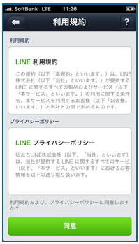 いつもながら分かりにくい日本語の説明にも関わらず、Appleが使いやすいなどと、一体どこの誰が言いふらしているのでしょうか? そもそも何でこんなメッセージが一番最初に表示される必要があるのでしょうか。 デフォルトは”非通知”で、必要なら後で”通知”にすれば良いだけの話です。 それはともかく、これを許可しないにすると、こちらからLINEを開かない限りメールが届いているかどうか分からないため、即効性を考えるとOKを選択した方が便利です。 ただし仕事中に頻繁にLINEメール到着の通知が届くのも困りますし、一番の心配は届いたメッセージの一部を近くの人に覗かれる心配がある事です。 それが気になる様でしたら、許可しないを選択しておいた方が良いかもしれません。 この設定は、後でいくらでも変更できます。 2) 新規登録![]() 続いて、新規登録をタップします。 3) 電話番号入力![]() 次にアカウントを作成するために、自分の携帯の電話番号を入力します。 ここでもう一つ面白い(恐ろしい?)事をお伝えしましょう。 最近新しく電話場号を取得した場合、以前その電話番号を使っていた人もLINEを使っていて、最後にLINEのアカウントを削除していないと、その前の使用者の友だちが表示されてしまうのです。 その場合は、一旦(以前の使用者のデータが残った)自分のアカウントを削除し、再度新規登録を行う必要があります。 そのままにしていると、いきなり見ず知らずの人から飲み会の誘いが届いたりします。 4) 利用規約電話番号を入力すると、次にLINEの利用規約が表示されます。 ![]() 面倒だと思われるでしょうが、LINEの利用規約とプライバシーポリシーをじっくり読みましょう。 利用規約の概要は既にご存知だと思いますが、何か不都合があってもLINEは一切の責任を負わない旨が書かれています。 またプライバシーポリシーには、以下の様に書かれています。