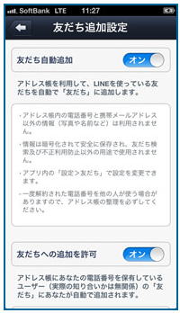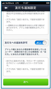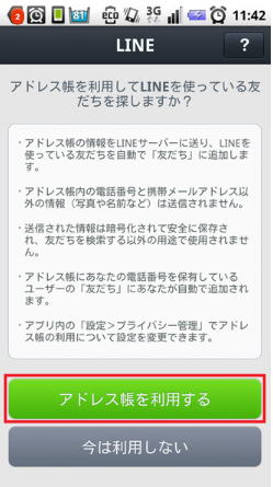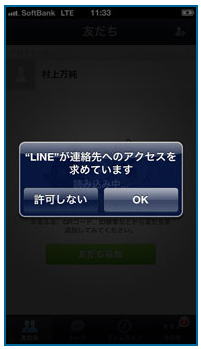 6) 友だち自動追加次第に架橋に入ってきました。 ここからは更に慎重に設定を選択していかなければなりません。 先ずは友だち自動追加です。 ![]() 一応説明らしきものが書かれていますが、知らないと何の事だか良く分からないと思います。 という訳で、この友だち自動追加をONにしたらどうなるのか、分かり易く順番にご説明したいと思います。 ①先ず貴方の端末にあるアドレス帳の中身が、全てLINEのサーバーに送られます。 普通の方でしたら、そう聞いただけでオフにしておこうと思うのではないでしょうか? 何しろ自分の個人情報だけでなく、知り合いの電話番号や携帯のメールアドレスまで、何があっても一切責任を負わないと断言しているLINEのサーバーに送られてしまうのですから。 ただし先ほどお伝えしました様に、アドレス帳にある知り合いの名前は送られないのがミソです。 定かではありませんが、もしかしたらこれで個人情報保護法の対象から外れるのかもしれません。 もしそうだとしたら、このデータが漏えいしても、LINEは当該法の罰則を一切受けないで済む事になります。 ところで、ご存知でしょうか? アンドロイド端末においては、以下の様にLINEのメッセージが異なり、”友だち自動追加”ではなく、”アドレス帳を利用してLINEを使っている友だちを探しますか?”になります。 ![]() アンドロイド端末では”アドレス帳を利用する”と表示される むしろこちらの方が親切な表記ではないでしょうか。 ②次にLINEは、貴方のアドレス帳を使って、貴方の知り合いがLINEに登録されていないか、携帯の電話番号を元に検索します。 ③そしてもし貴方の知り合いがLINEに登録されていたら、その知り合いの名前を貴方のLINEの友だちリストに表示するという訳です。 ただし全ての人が友だちリストに表示される訳ではありません。 この次に出てきますが、知り合いが”友だちへの追加”を許可している場合のみ、友だちリストに表示される事になります。 ただし貴方の知り合いが”友だちへの追加”を許可していなければ何も表示されないかと言えば、それも違います。 LINEには更に友だちかもというリストがあり、その場合は友だちかもリストに表示される事になるのです。 さて、今までは自分のLINEに知り合いが表示される話をしてきましたが、忘れてはいけないのは相手のLINEにも自分が表示されるという事です。 すなわち、もしここで一度サーバーに自分の電話帳を送ってしまうと、今度は知り合いのLINEにも貴方が表示されてしまうのです。 話が長くなってしまいましたが、結論です。 友だち自動追加をオンにできるのは、アドレス帳の人数がある程度限られており、誰もが親しい間柄である場合だけと思った方が無難です。 それ以外に、例えば仕事先や町内会など事務的な連絡先がアドレス帳に記載されている場合は、オンしない事をお勧めします。 もしそのままオンにした場合、大して親しくもいない人のLINEに貴方の名前が表示される事になります。 ただしここにも余り知られていない耳よりの話があります。 ご存じの様にLINEに登録できるのは、携帯の電話番号だけです。 ですので、例え仕事先や町内会や美容院やレストランであろうと、アドレス帳に登録された電話番号が据え置きの電話番号でしたら、LINEには全く関係しません。 7) 友だちへの追加を許可次は友だちへの追加を許可です。 ![]() これは前項でご説明したので、内容は概(おおむ)ね分かって頂だいていると思います。 これをオンにすると、もし相手のアドレス帳に貴方の電話場号が記載されていると、自動的に相手のLINEの友だちリストに貴方が登録される事になります。 ただしこれをオフにしていても、相手のLINEの知り合いかものリストには、結局貴方が登場する事になります。 ただしオンにしていると、知り合いでもない人に自分のプロフィールを見る権利を与えてしまう事になりますので、必ずオフにしておくべきです。 8) 利用登録次にLINE上の名前を登録します。 ![]() 友だちに貴方と分かれば、ニックネームでも何でも構いません。 むしろ友人としかLINEをしないのであれば、ニックネームの方が良いかもしれません。 それが分かった所で、ここでまた恐ろしい事をお伝えしておきましょう。 上記の様に、LINEに登録する名前は、何でも構いません。 ですので、うっかり知っている人だと思ったら、別人が知り合いの名前と写真を使って成りすましている可能性もあり得ますので、重要な交信には必ず本人かどうかの確認が必要になります。 9) 連絡先へのアクセス許可最後に端末のOSが、連絡先(アドレス帳)へのアクセス許可を求めてきますので、OKをタップします。 ![]() なおここが最後のチャンスですので、やっぱりアドレス帳をLINEのサーバーに送るのは止めようと思ったらここで許可しないを選択できます。 またアドレス帳を送った後でも、アカウントを削除すれば、サーバー内のアドレス帳を完全に消去する事が可能