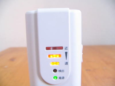 早速市販の盗聴器に近づけてみますと、廉価版の盗聴発見器においては、殆ど接触する程近づかなければ反応しないのに対して、1m前後離れた状態でも十分反応します。