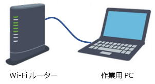 ②Wi-Fiルーターと作業用PCをLANケーブルで接続して、両者の電源をONします。