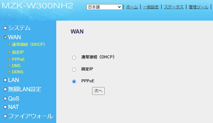 ⑦次に管理画面のWANを選択すると下の画面が表示されますので、PPPoEをクリックして次へをクリックします。