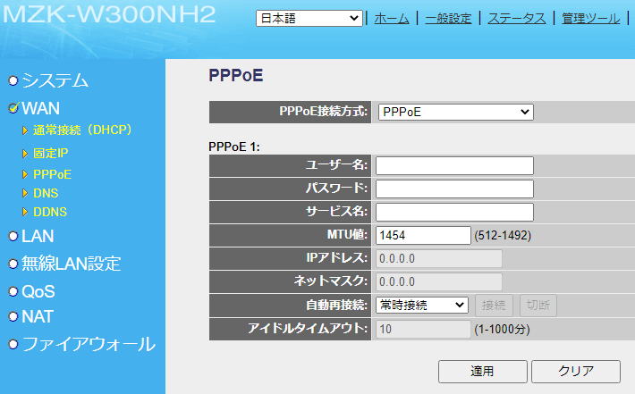 ⑪念のため、もう一度PPPoEを選択してユーザー名とパスワードが入力されている事を確認してから、Wi-Fiルーターの電源を切ります。