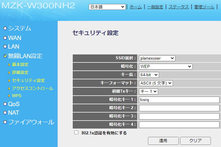 ⑩次に無線LAN設定を選択して、Wi-Fi接続時のパスワードとなる暗号化キー(下の場合ならlvxrq)を確認しておきます。