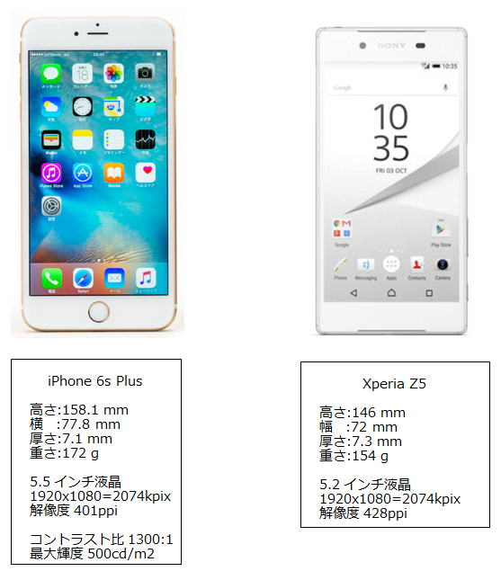 このため本書においては、売れ筋である大型画面のiPhone 6s PlusとXperia Z5を比較してみたいと思います。