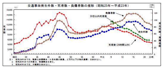 以下は1950年(昭和25年)から20112年(平成23年)までの国土交通省発表の交通事故発生状況の推移です。