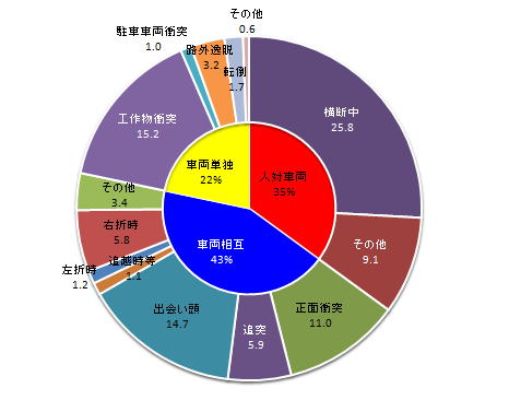 車両相互:43%(出会い頭:15% 、正面衝突:11%、右左折:7%、追突:6%)