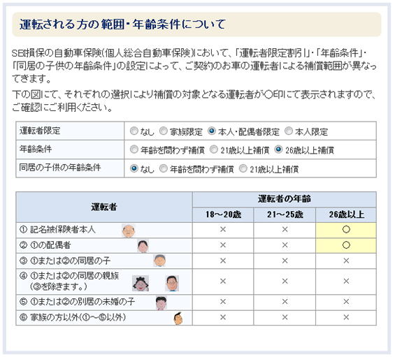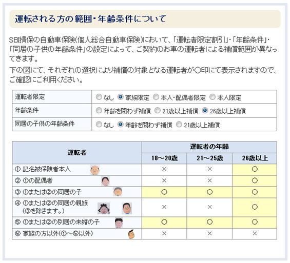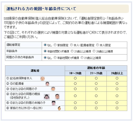 この上のボタンを選択する事で、補償対象となる運転者が以下の様に明確に分かります。