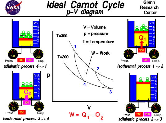 カルノーサイクルでは、熱を仕事に変える事もできますし、逆に仕事で熱を奪う事もできる現実には存在しない可逆性熱機関です。