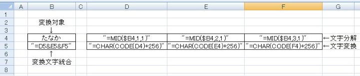 今度は逆に、カタカナ⇒ひらがな変換式は以下の通りです。