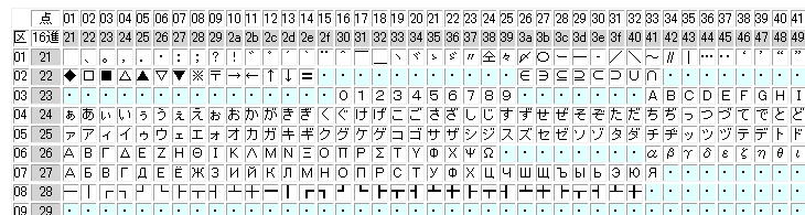 以下の表は、JISの2バイト文字コードの配列です。