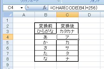 すなわち、B4セルに入っている”あ”の文字が、C4セルでは”ア”になって出力されるという訳です。
