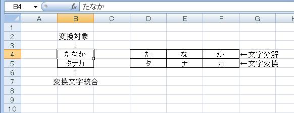 この場合1文字だけの変換ですので、実用性を考えて、今度は名前をひらがなからカタカナに変換する場合を考えてみましょう。