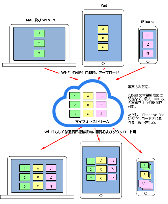 iPhoneで撮影された写真だけを、転送用として一時的にiCloudに格納する。 Wi-Fi接続時にのみ自動で行われる、手動で通信回線を使ってはできない。 iCloudフォトライブラリとは異なり、無料で最大1000枚の写真が30日間保存される。 また、iCloudの5GBの制限容量には関係しない。 |