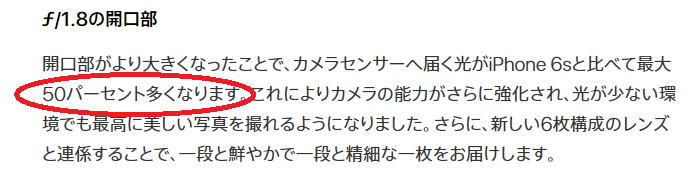 Appleとしては、恐らく単純に小数点1位で四捨五入された公称値のF2.2とF1.8の数値を使って、以下の計算で50%アップ(正確には49%)としたのでしょう。 2.2^2÷1.8^2= 4.84÷3.24= 1.49