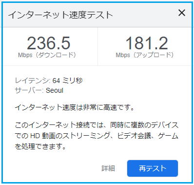 例えば、Wi-Fiを5GHzにして以下の様にこれでもかという速さにしても変わりません。