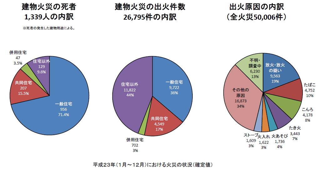 先ず、日本での1年間の住宅出火件数(総出火件数から住宅以外の出火件数を除く)ですが、総務省の平成24年の資料(下記参照)によれば、14973件(死者1270人)との事です。