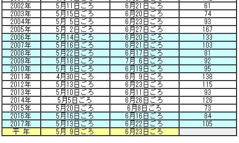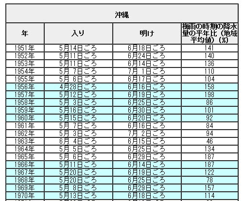 上の表は、沖縄の過去66年間の梅雨入りと梅雨明け日を示す表です。