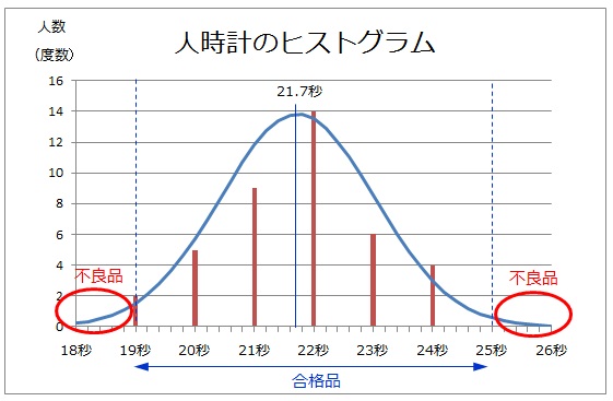 例えば、この人時計が製品だとして、その合格の規格を22秒±3秒だとします。