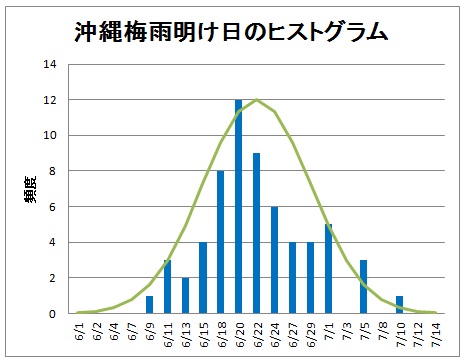 そのうち、今回は(皆さんが興味を持つかもしれない)沖縄の梅雨明けの日を、その発生頻度で集計してみます。